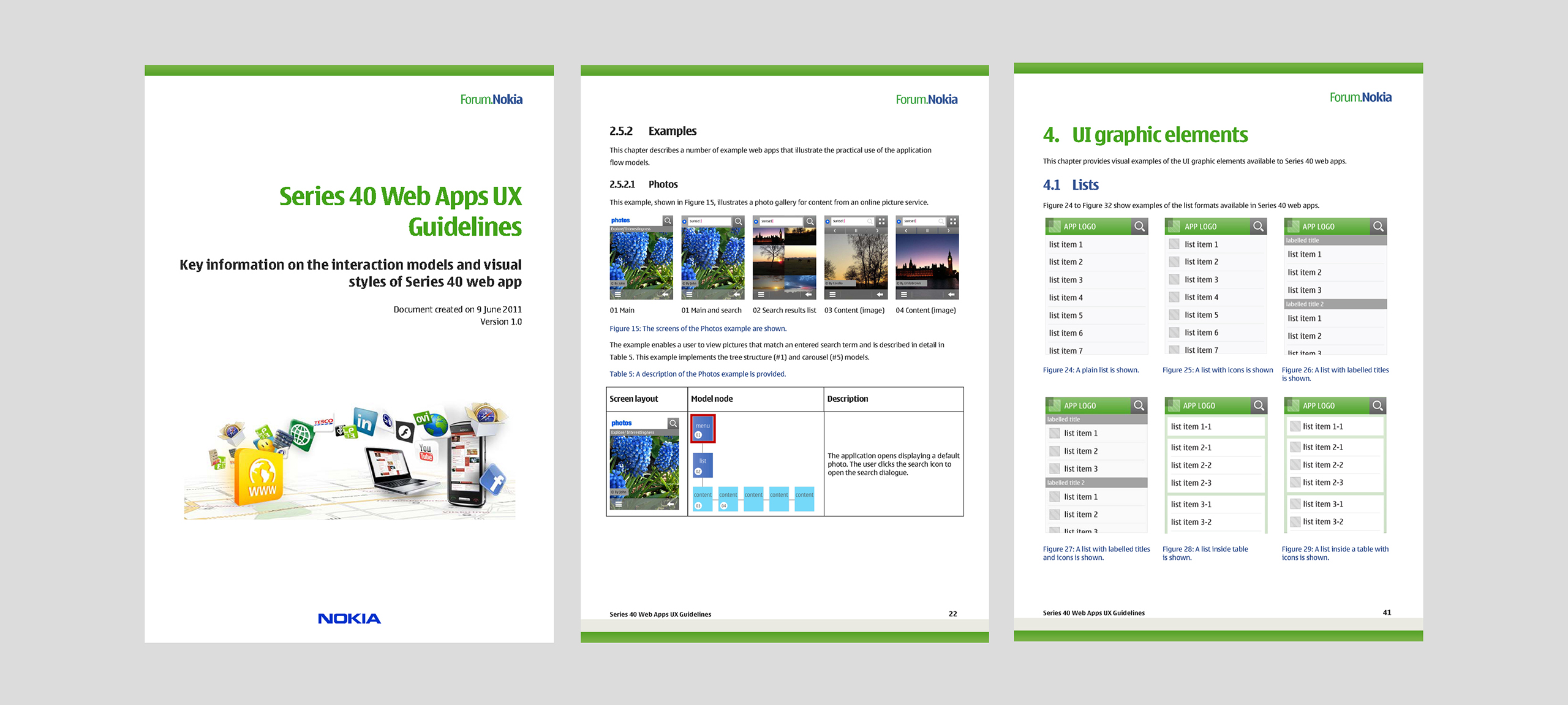 It consists of four sections, which are explaining S40 device characteristics, web apps structures with common flows, various examples, and UI graphic elements.