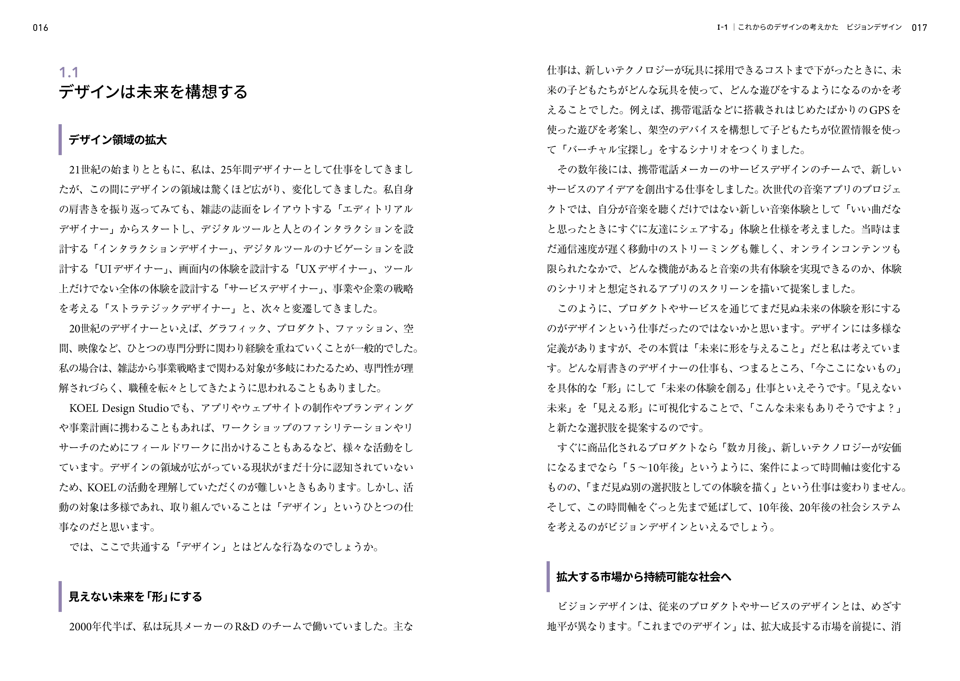 「プロダクトやサービスデザインの開発を超えた広い視野で、今、起こっている・起こり始めている社会の変化に目を向け、10年後、20年後に社会がどうなっているのか、そのなかで私たちはどんな「暮らし」をしたいのか、その実現のためにどんなことをしていくとよいのかを考える活動として、ビジョンデザインを実施してきました。 この本で語っている「ビジョン」はMVVのような企業が「存在意義」「目指す姿」「価値観・行動指針」を経営理念として定義して目標を作ることではなく、世の中がどうなるのかを予言するためのものでもなく、社会が変化していくということを受け止め、その上で、自分たちがどう暮らしたいのかを考える活動です。